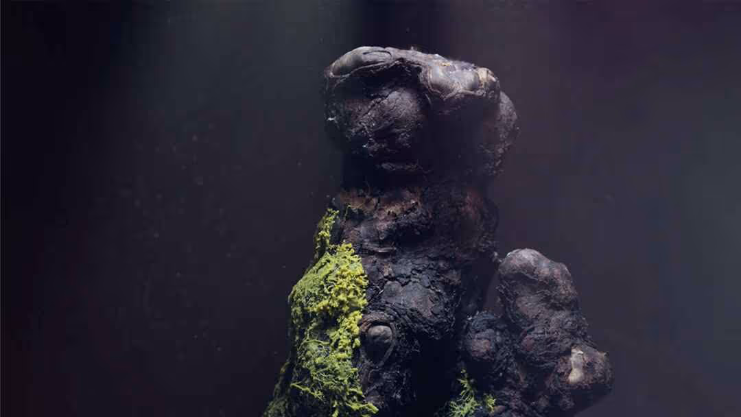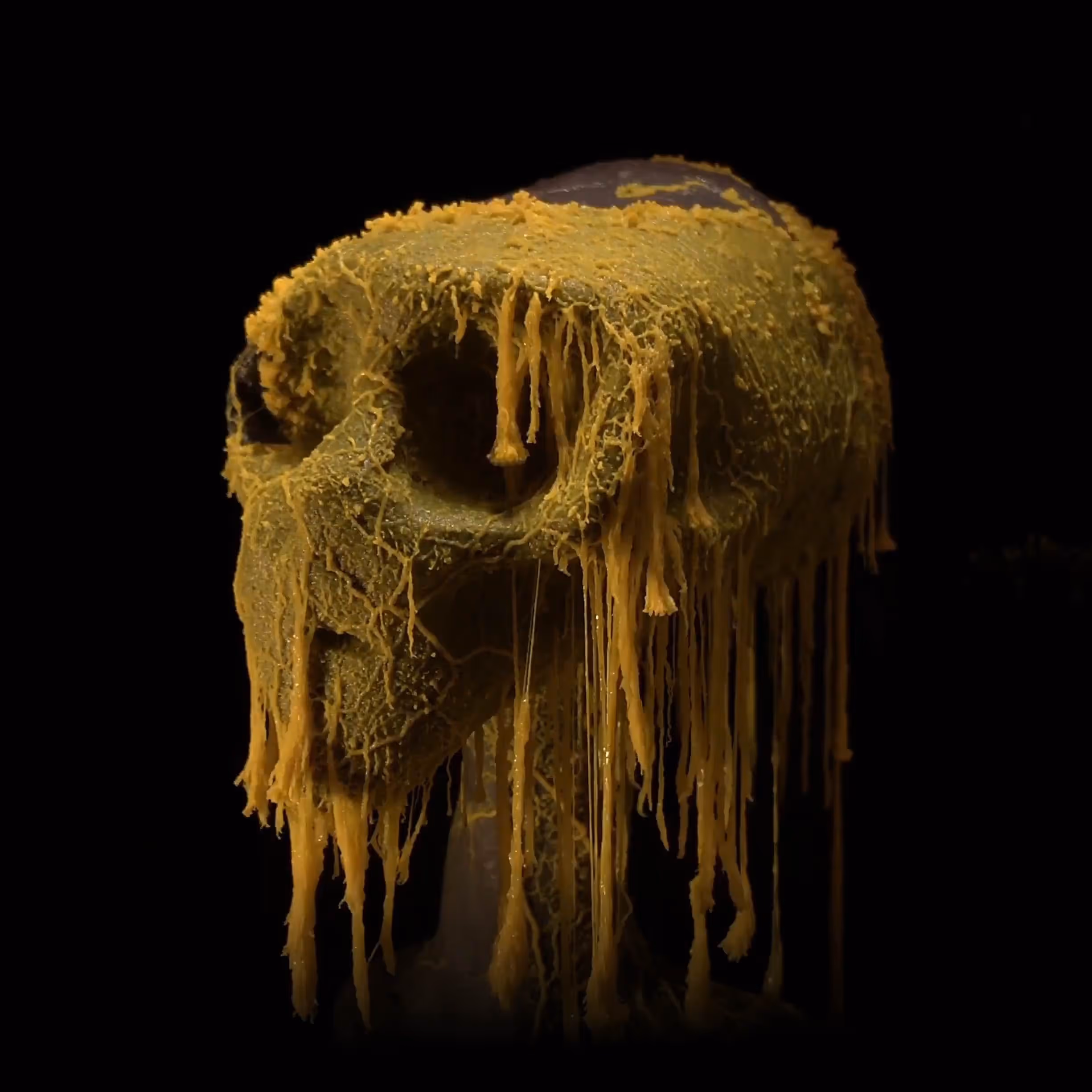 About this media - Selection from a series of black clay models, about 1 tbsp of Physarum polycephalum, set free in a climate controlled glass case, black velvet background, timelapse sequence 1 shot every 30 sec, 5 day duration.